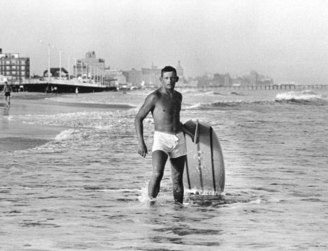 Unfortunately, I could not take my own photographs and I was never captured in the arms-behind-back pose. Here is a typical mid-summer 5 foot wave in New Jersey: walking toward the front of the board, a characteristic Atlantic City afternoon in late July.