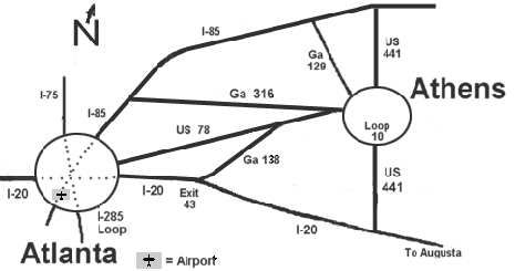 Atlanta also has a loop, I-285. The best route to Athens from Atlanta (and West) is usually I-85 to Rt 316. Best route from North is usually I-85, exit onto Rt 129 south. |