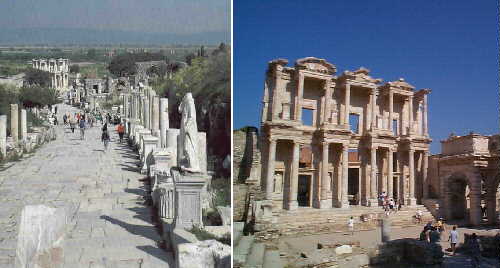 Photo: on the left, the ancient road to the harbor. On the right, the Library of Celsus.